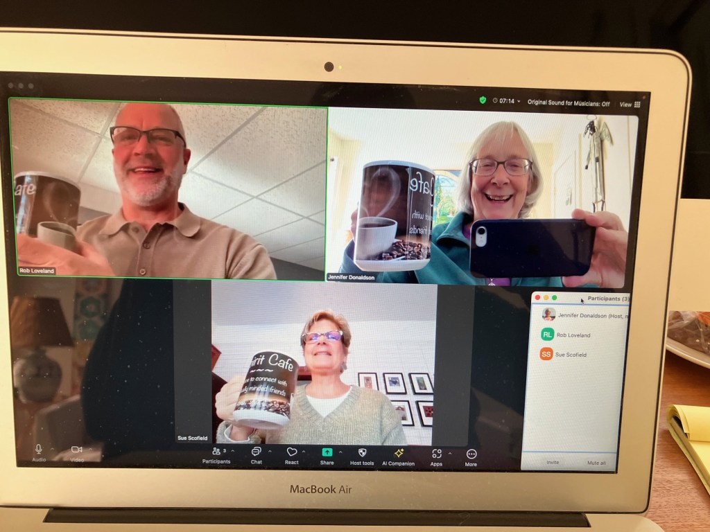 This picture was snapped just as we, Sue, Rob and I -Jen- started to come on for last month’s conversation and you can see by our faces, we really love Spirit CAFE!! It’s not just the camaraderie, it’s also the way we spur each on to find the highest perspective, the one that makes your heart zing and eases life’s tensions. I always feel like I’m walking on air after one of our CAFE conversations!