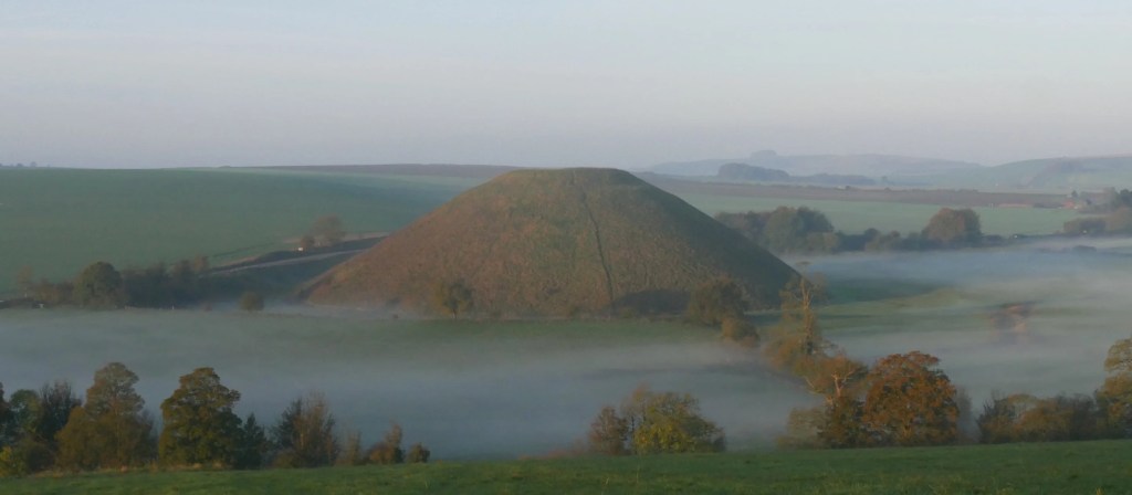 As we make our way down, we can see the top of Silbury Hill. It is an observation post to allow others to see both the enclosure that we just left as well as the sanctuary and the avenues that connect them. It is a vantage point to see the entire structure, strewn across a fairly large portion of the landscape.